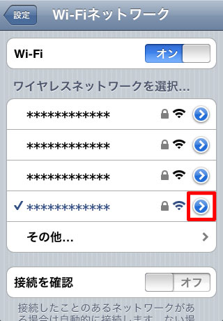 6.上図のようにワイヤレスネットワークのSSID左側にチェック(レ点)が入ります。接続されたかどうかの確認をするために、赤枠の矢印ボタンをタップします。